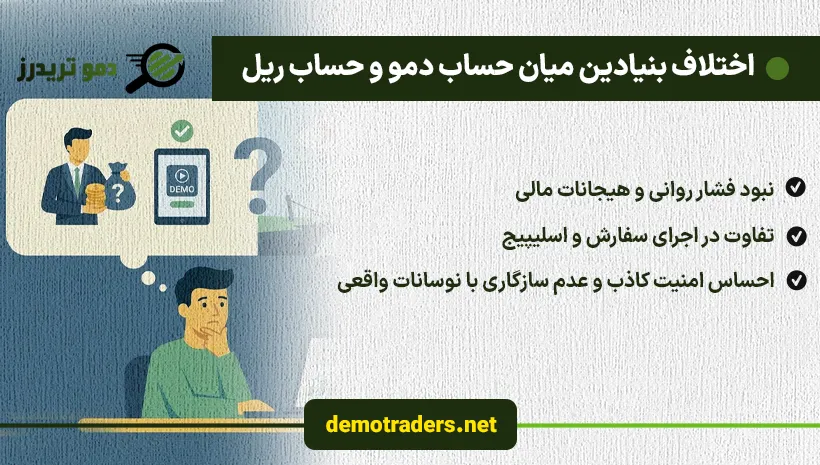 اما آن چه کمتر مورد توجه قرار می گیرد، اختلاف بنیادین میان حساب دمو و حساب ریل است. معامله گرانی که فقط در دمو موفق اند اما در حساب واقعی دچار زیان می شوند، معمولاً با یکی از اهداف یا احساسات زیر درگیرند: